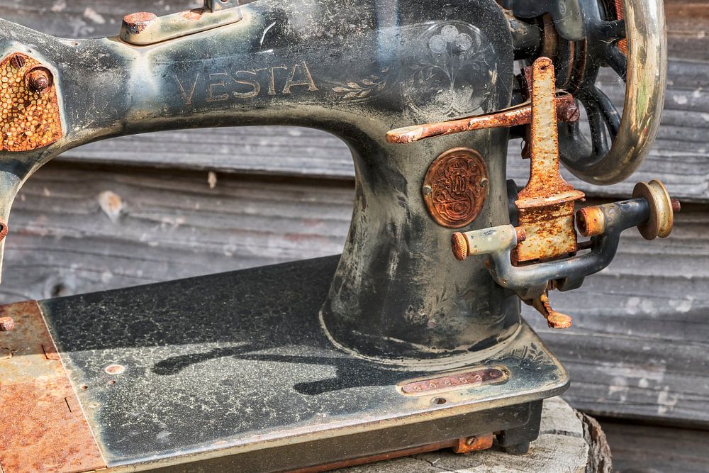Eine alte Nähmaschine der Marke Vesta steht auf einem Baumstumpf