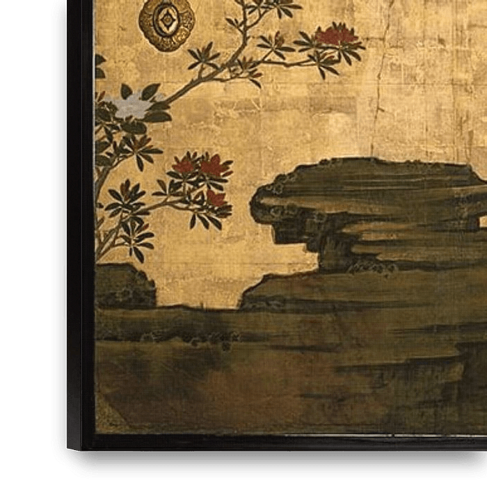 Der massive schwarze Stamm eines uralten Pflaumenbaums mit geschwungenen, sich windenden Ästen überspannt fast sechs Fuß über vier Schiebetafeln. Der reptilienartige alte Baum treibt Blüten aus, die die Atmosphäre eines kalten Vorfrühlingsmorgens vermitteln und Geburt und Erneuerung symbolisieren. Diese Tafeln bildeten ursprünglich eine Wand eines Raumes im Tenshōin, einem Untertempel des Myōshinji, einem Zen-Tempel in Kyoto. In den 1880er Jahren wurden sie an einen privaten Sammler verkauft und oben auf die kleineren Abmessungen seines Hauses zugeschnitten.