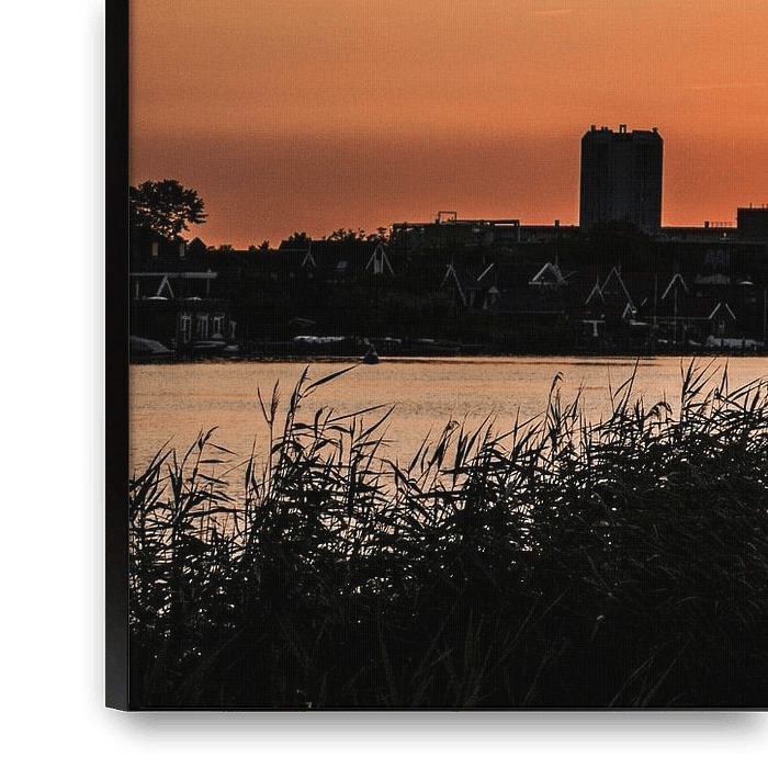 Bestelle das Foto Alte holländische Mühle an der Zaanse Schans mit untergehender Sonne von Johan Veenstra als Reproduktion auf Leinwand, Alu-Dibond, als Poster, Fototapete oder Acrylglasbild.