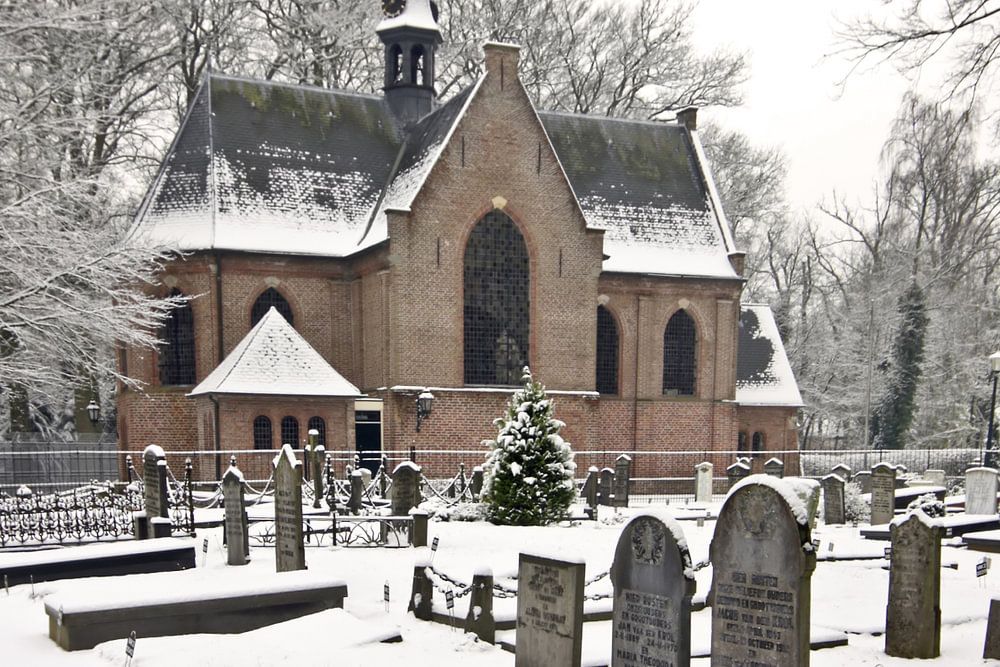 Verschneite alte mittelalterliche Kirche im Schnee in Lage Vuursche im Winter