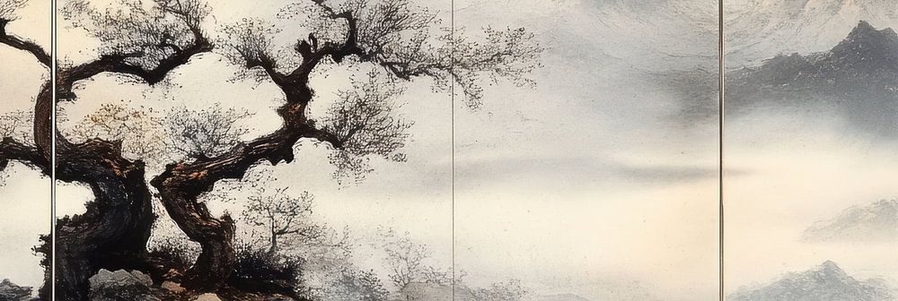 Die Kombination aus sanftem Nebel, Erdtönen und schwarzen Linien macht dieses Werk zeitlos. Es passt perfekt zu einer japanischen Einrichtung, die der Natur, der Stille und der Tradition Raum gibt.