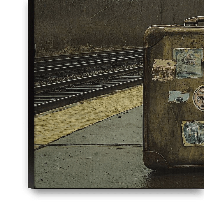 Dieses Bild verströmt Nostalgie und Abenteuer mit einem verwitterten Koffer auf einem verlassenen Bahnsteig. Der Koffer ist mit alten Reiseetiketten beklebt, die an ferne Ziele und vergangene Tage erinnern. Der graue Himmel und die leere Umgebung verstärken das Gefühl der Trostlosigkeit und des Wartens auf das nächste Abenteuer. Dieses…