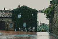 Platz in Vinci mit einer überwucherten Fassade.