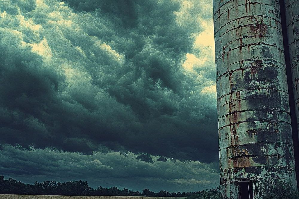 Dieses beeindruckende Bild zeigt ein altes Getreidesilo, das einsam in einem verlassenen Feld steht, unter einem drohenden, bedeckten Himmel. Die dunklen, grünlichen Töne der Landschaft und des rostigen Silos stehen im Kontrast zu den dramatischen Wolken, die sich über ihm auftürmen. Dieses Bild strahlt ein Gefühl von Trostlosigkeit und Nostalgie aus und versetzt den Betrachter in eine Zeit zurück, in der dieses Silo eine wichtige Rolle im landwirtschaftlichen Leben gespielt haben mag. Perfekt für Liebhaber von alter Architektur und dramatischen Landschaften. Dieses Bild eignet sich perfekt als Hintergrund für Räume, die eine rustikale und geheimnisvolle Atmosphäre ausstrahlen sollen.