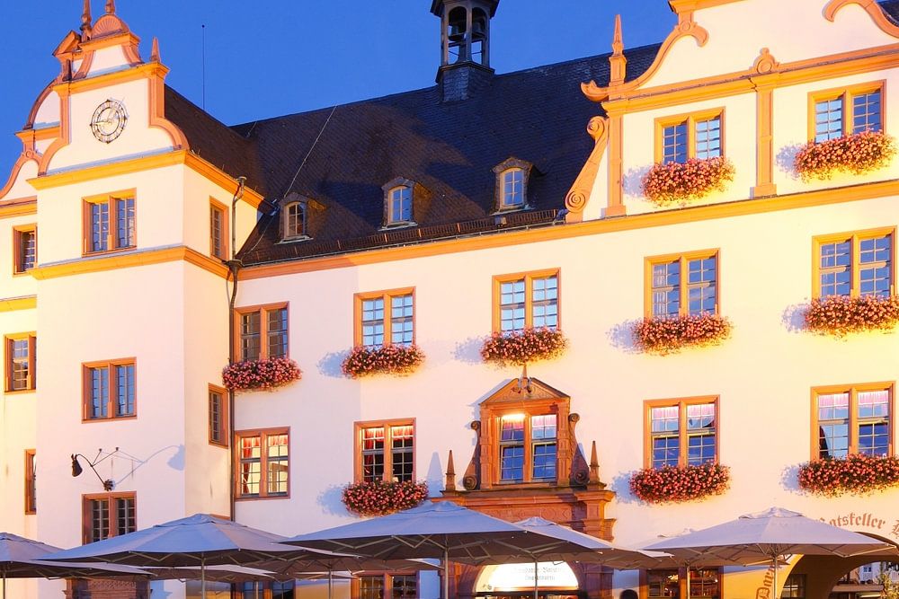 altes Rathaus am Marktplatz bei Abenddämmerung, Darmstadt, Hessen, Deutschland, Europa