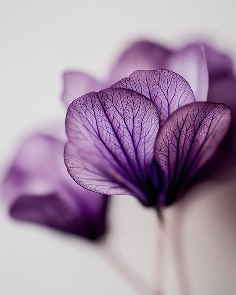 Ein minimalistisches Makro von durchscheinenden violetten Blütenblättern, das zarte Adernmuster offenbart, die sowohl botanisch als auch abstrakt wirken. Weichzeichner und sanftes Licht verwandeln die Blume in eine Studie über Zerbrechlichkeit, Ruhe und stille Eleganz.