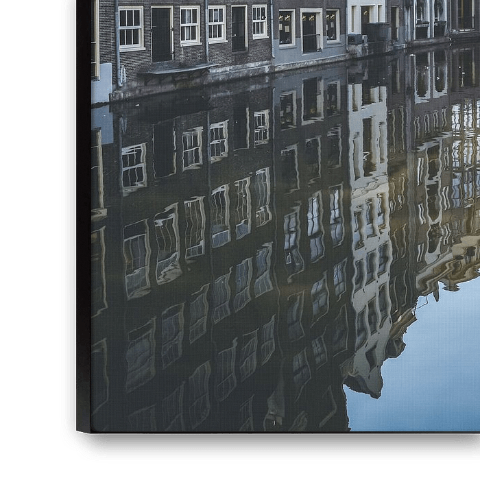 Amsterdamer Häuser spiegeln sich bei schönstem Sonnenschein im Wasser.