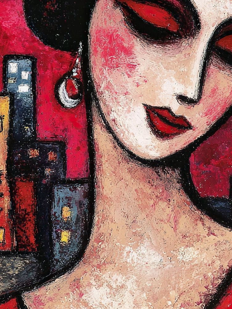 Details: Frau, Gemälde, rotes Kleid, Ohrringe, Stadt, Gebäude, Farbe, modern, Porträt, Frauenbild