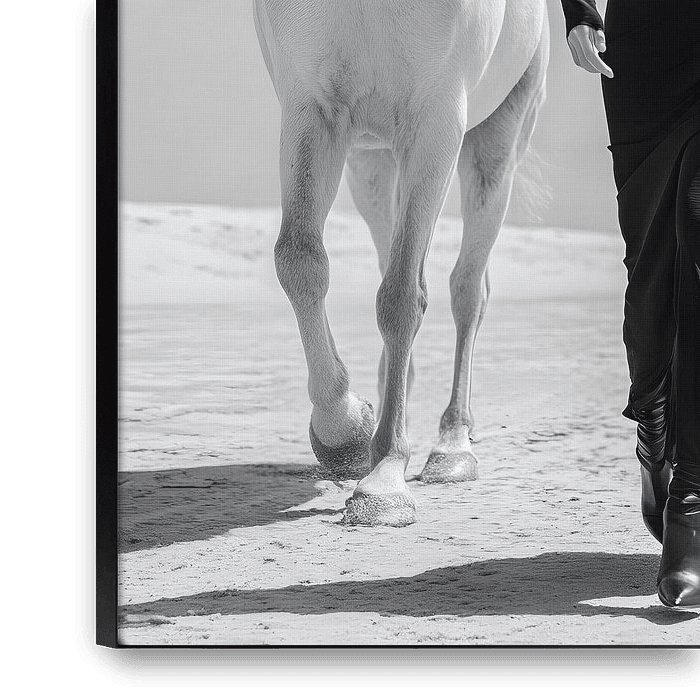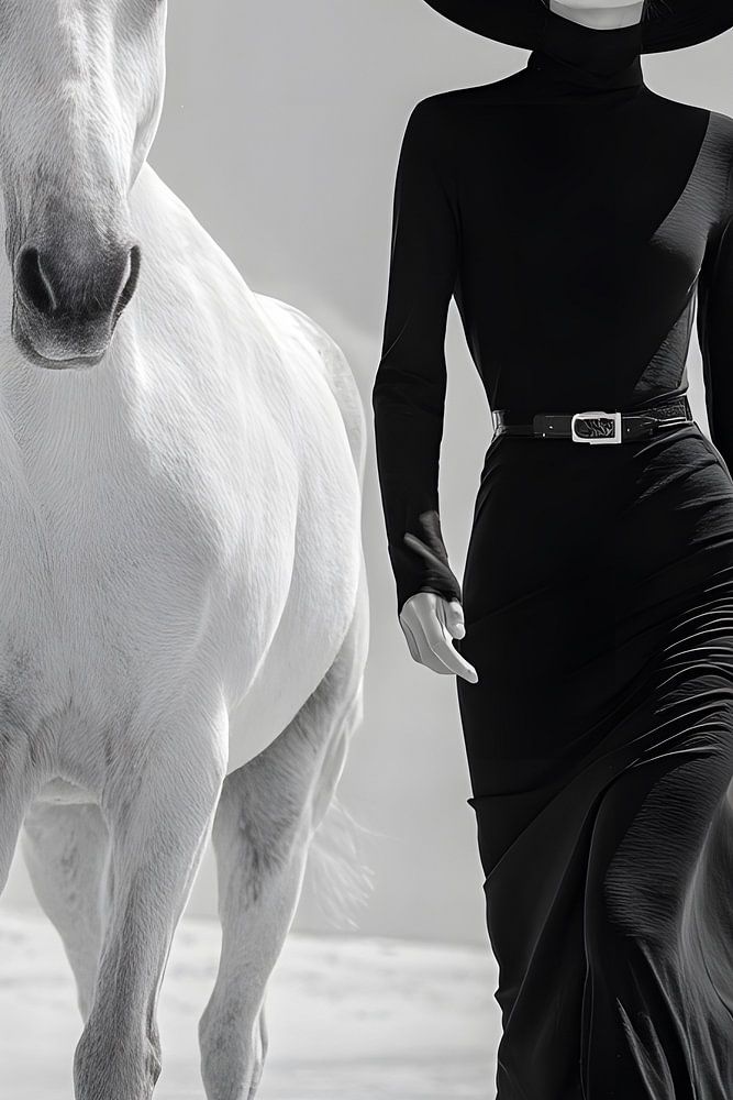 Das Schwarzweißbild zeigt eine elegant gekleidete Frau in einem langen, fließenden schwarzen Kleid und breitkrempigem Hut, die selbstbewusst durch eine helle, wüstenartige Landschaft schreitet. Neben ihr läuft ein weißes Pferd im gleichen Rhythmus. Die reduzierte Szenerie, der klare Horizont und der starke Hell-Dunkel-Kontrast lenken…