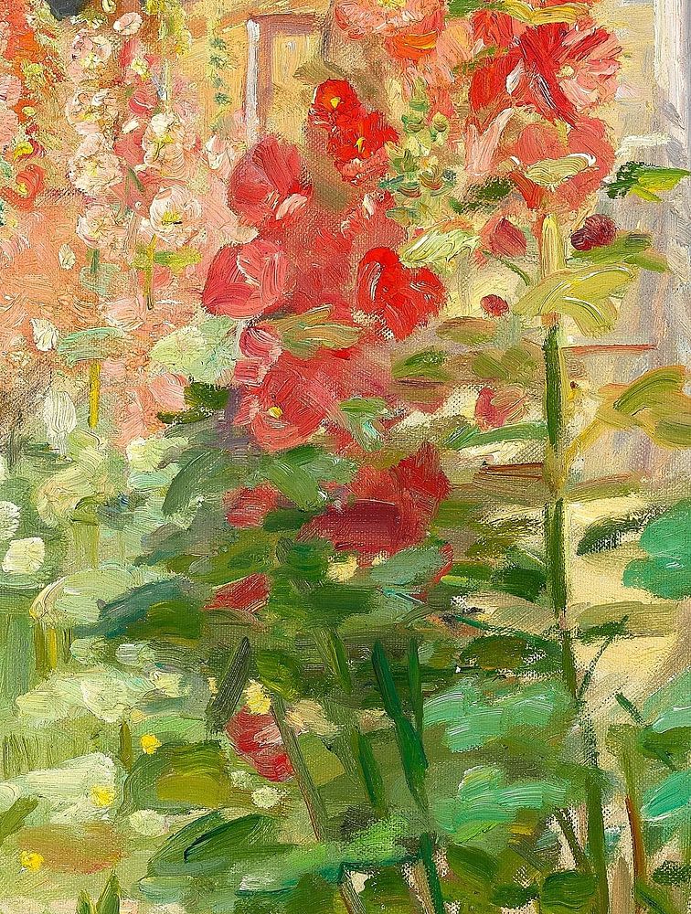 Rote Stockrosen im Garten des Hauses der Familie Ancher am Markvej in Skagen.