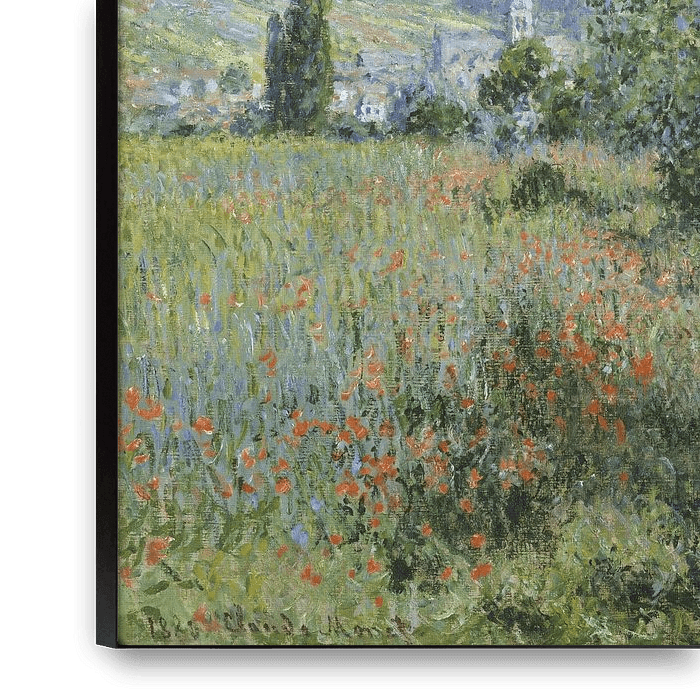 Der Fußweg durch das Mohnfeld eingerichtet, um die Art und Weise in Richtung des Kirchturms in Vétheuil, das Dorf nordwestlich von Paris, wo Monet Haus in 1878. unten rechts Punkten Wicklung Obwohl die Landschaft kontinuierlich erscheint, malte der Künstler diese Ansicht von einer Insel in der Seinem Fluss; das Wasser wird durch einen Stand von Pappeln verdeckt.