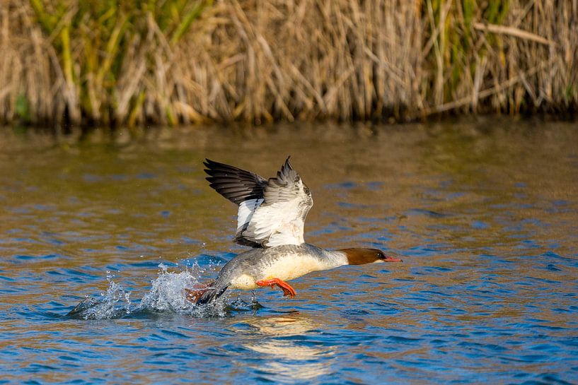 Dieser Gänsesäger hielt an und hob sich aus dem Wasser