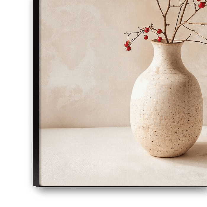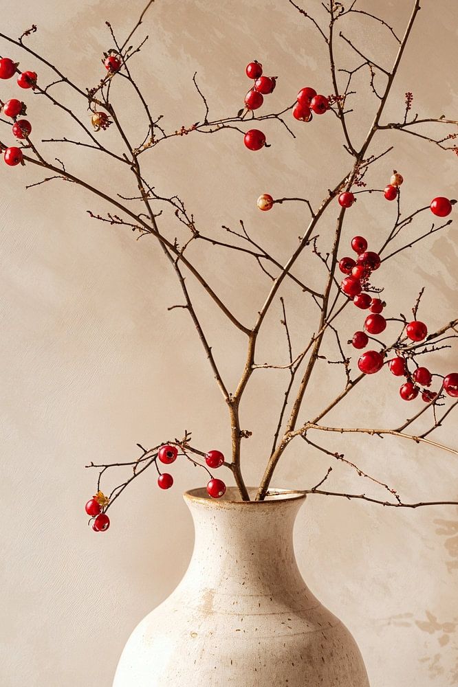 Entdecken Sie den rustikalen Charme dieser antiken Keramikvase, in der die Einfachheit der Natur auf das Erbe der Vergangenheit trifft. Die Vase mit ihren erdigen Beigetönen und subtilen Sprenkeln wirkt warm und einladend. Zurückhaltend und doch auffallend, trägt sie zur ruhigen Atmosphäre eines jeden Raumes bei. Ihr robustes, schlichtes Design macht sie zu einem zeitlosen Schmuckstück, das die Schönheit der Einfachheit widerspiegelt. Die Zweige mit den leuchtend roten Beeren heben sich wunderbar von der neutralen Farbpalette ab und schaffen eine natürliche Ästhetik, die sowohl das Auge als auch die Seele besänftigt. Dieses Design ist nicht nur ein Dekorationsstück, sondern eine Geschichte, die darauf wartet, in Ihrem Zuhause erzählt zu werden.