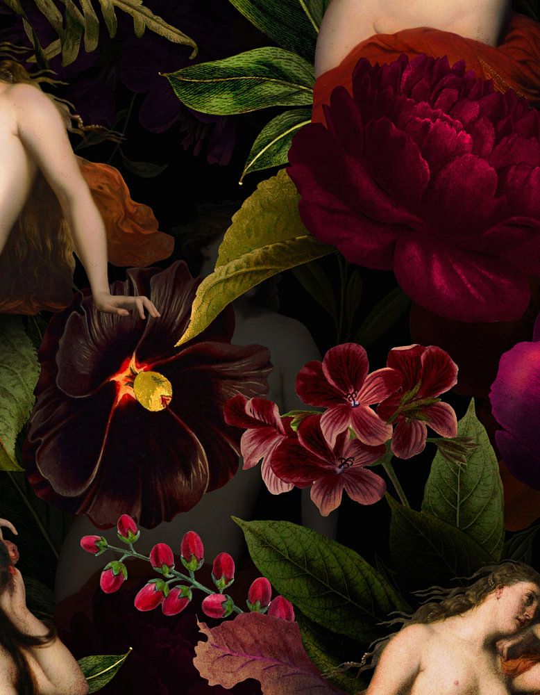 hier habe ich antique, handgemalten nackte Nymphen aus dem 16. und 17. Jahrhundert mit dunklen Blüten zu einem wunderschönen Muster kreiert.
