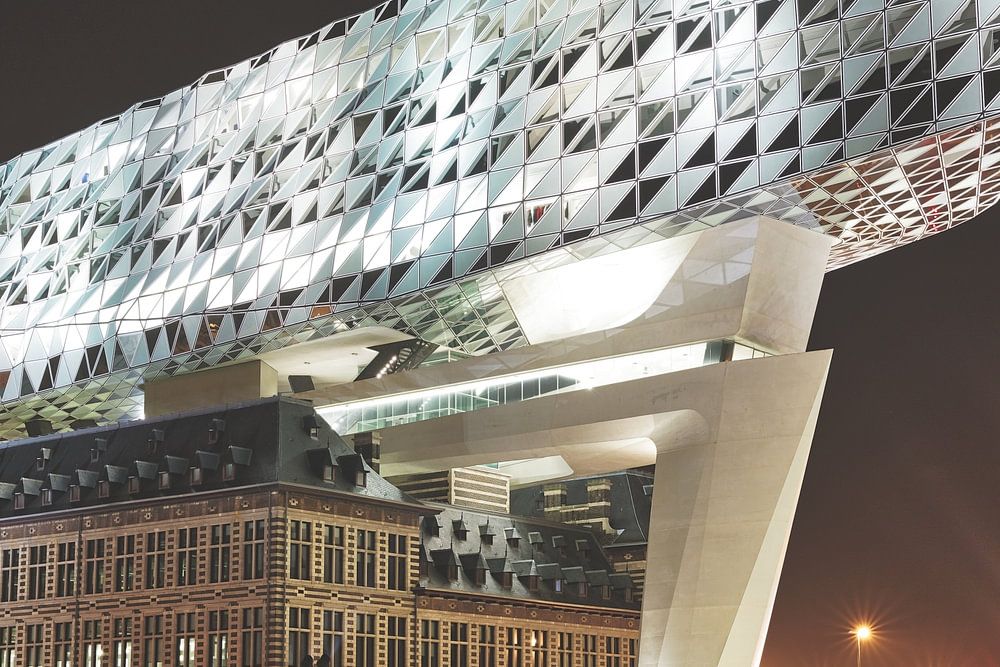 Hafenbüro in Antwerpen; ein Zusammentreffen von alter und moderner Architektur. Belichtet in der Dunkelheit mit Sternen am Himmel.