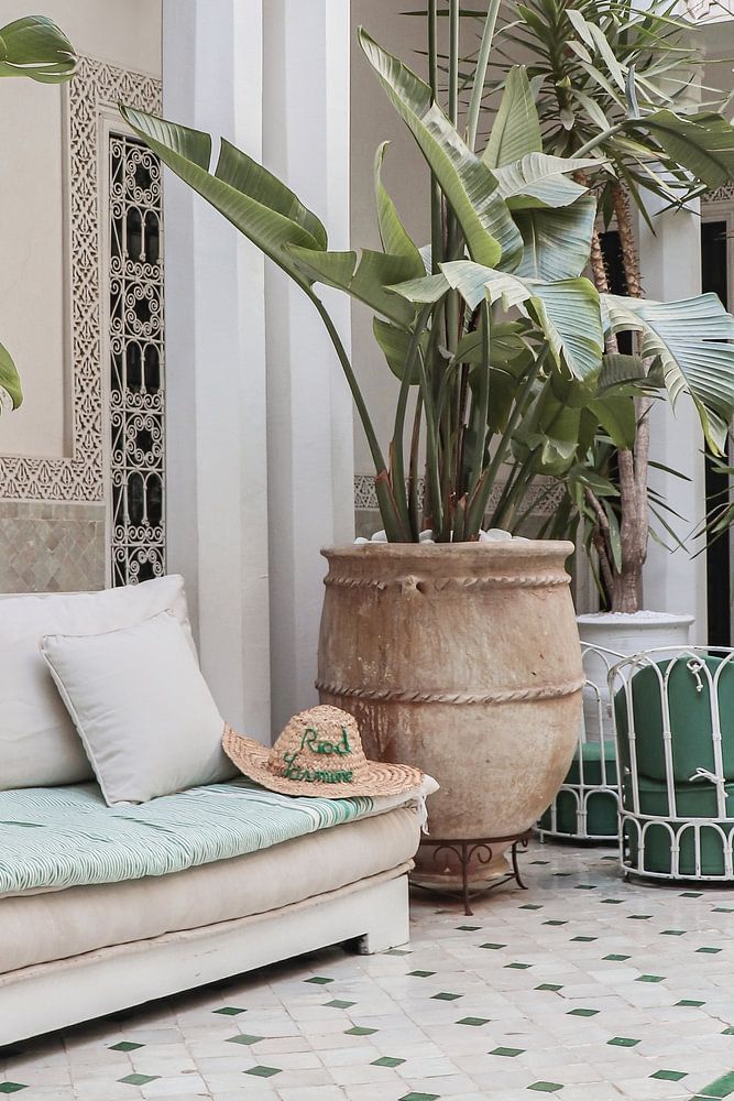 Ein wunderschönes grünes und weißes Interieur eines traditionellen Riads im Herzen von Marrakech. Diese Riads sind wirklich wunderschön und ein Fest zu bleiben in. An jedes Detail wurde gedacht und jede Ecke ist fotogen. Marokko ist voll von wunderschönen Riads, also wenn Sie jemals die Chance bekommen, dort zu übernachten, sage ich, tun Sie es!