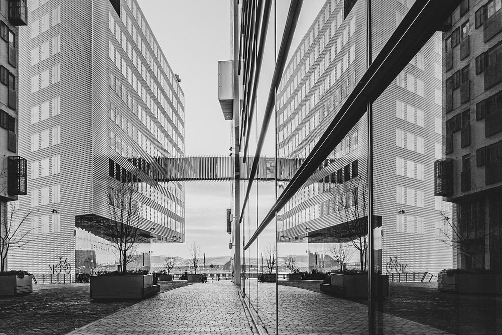 Moderne Büro- und Wohngebäude auf einer künstlichen Insel am Rande des Zentrums von Amsterdam. Schwarz-Weiß-Architekturfoto mit Spiegelung in großen Glasfenstern und perspektivischen Linien.