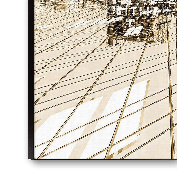 Das Bild zeigt einen fiktiven Gebäudekomplex mit Wolkenkratzern, die sich im Boden spiegeln. Die skizzenhafte Darstellung verleiht dem Bild eine gewisse Lebendigkeit und Dynamik, die den Betrachter in die Welt der Zukunft entführt. Die erdigen Farbtöne erzeugen eine warme und einladende Wirkung, die das Bild noch attraktiver macht.