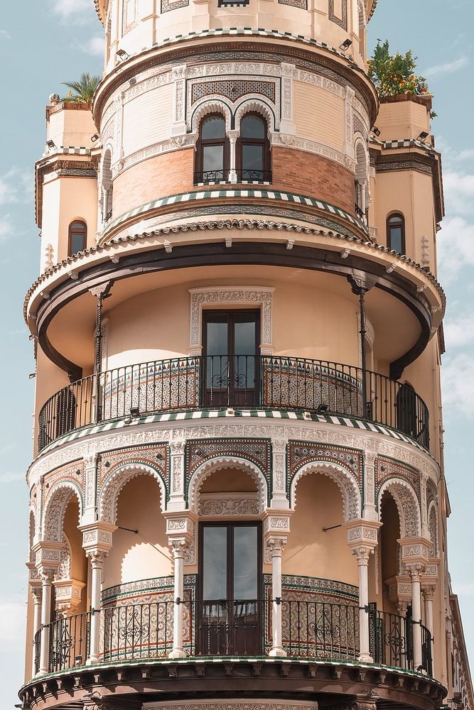 Das Bild zeigt die ganze Pracht dieses Gebäudes: die reich verzierten Bögen, die schmiedeeisernen Balkone und die warmen Farbtöne von Stein und Ziegeln. Das weiche spanische Licht verstärkt die Farben, während der blaue Himmel mit leichten Wolken eine luftige und helle Atmosphäre schafft. Das Bild hat eine gewisse Symmetrie und Stärke, die fast an das ikonische Flatiron Building in New York erinnert - allerdings mit einem eindeutig andalusischen Charakter.