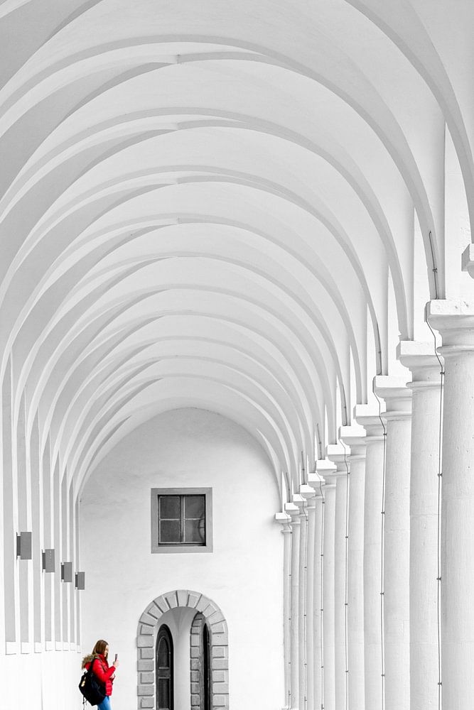 Frau mit roter Jacke im weißen Arkadengang vom Stallhof in Dresden