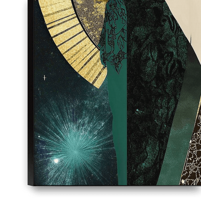 Art-Déco-Porträt einer Frau mit kurzen schwarzen Haaren, die einen dunkelgrünen und goldenen Sari trägt, mit einem himmlischen Hintergrund, der eine kosmische Galaxie und Nebel am Himmel, einen Sonnenschein um ihren Kopf und geometrische Art-Déco-Muster in einem goldenen Rahmen zeigt.