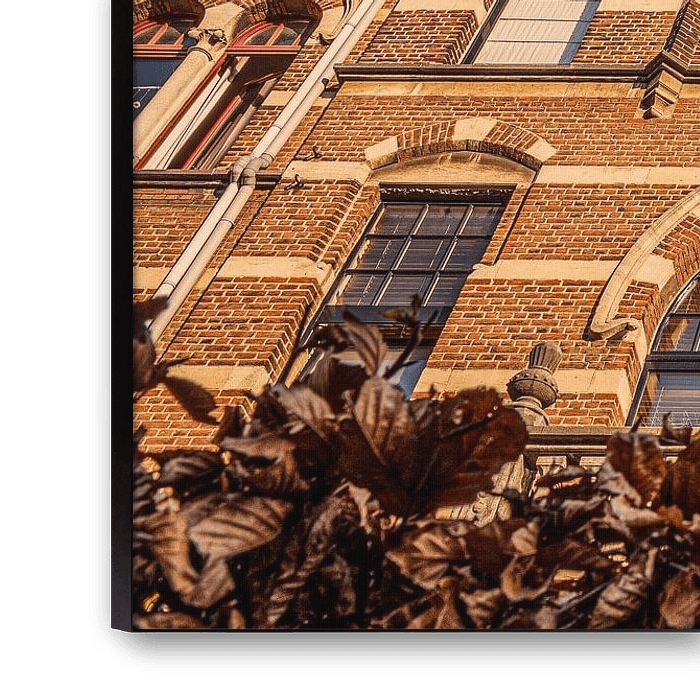 Das Bild fängt nicht nur eine Fassade ein, sondern auch die Atmosphäre einer Epoche, in der die Architektur Kunst und Handwerk verbindet. Das weiche Abendlicht fällt auf die zarten Ornamente, betont die fließenden Formen und wirft einen warmen Schein auf die Steine der Fassade.