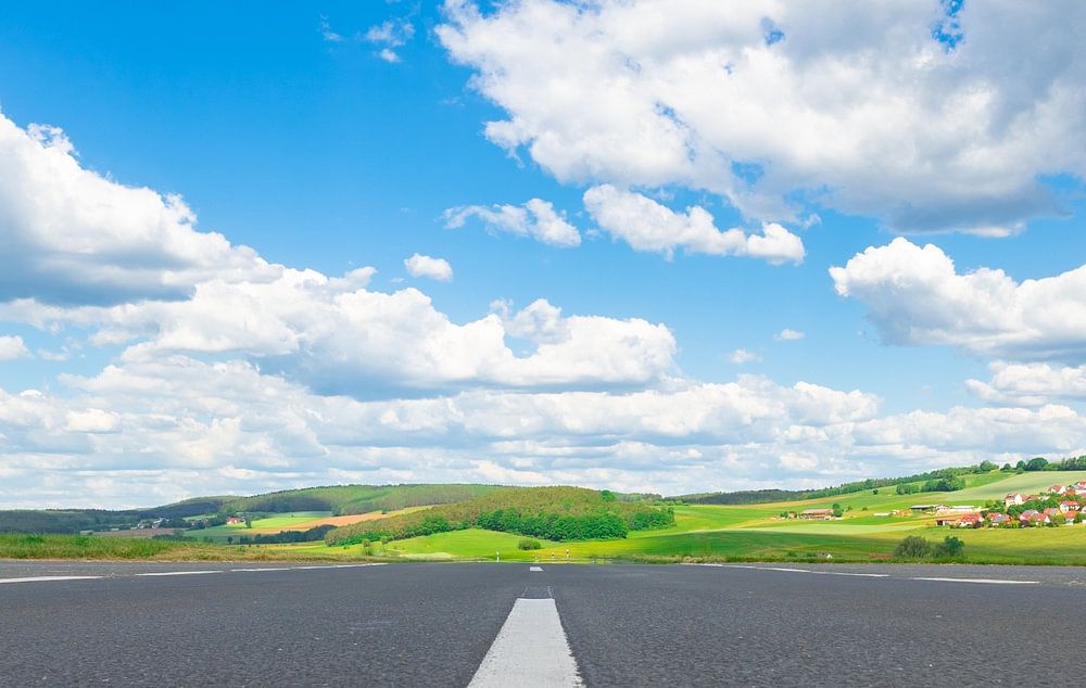 Asphaltstraße mit weißen Trennlinien, schöne Landschaft und bewölkter blauer Sonnenhimmel