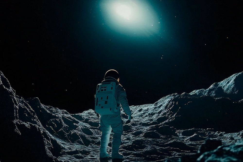 Ein überwältigendes Szenario, das die unendlichen Weiten des Kosmos und die Einsamkeit des Weltraums einfängt. Sanfte Lichtstrahlen beleuchten die mondähnliche Oberfläche und ziehen den Betrachter in eine Traumwelt voller Abenteuer und Mystik. Dieses Kunstwerk eignet sich ideal für ein modernes Wohnzimmer, um Gespräche zu inspirieren und die Fantasie anzuregen.