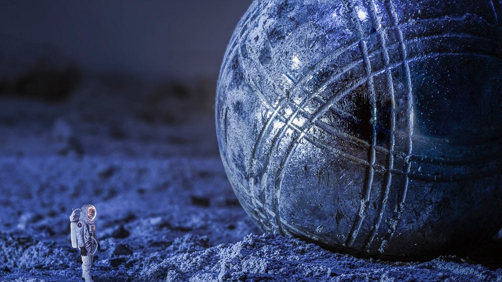 Kreation aus Holzkohle, Asche, einer Bocciakugel, Licht aus verschiedenen Lampen und farbigen Glasplatten.