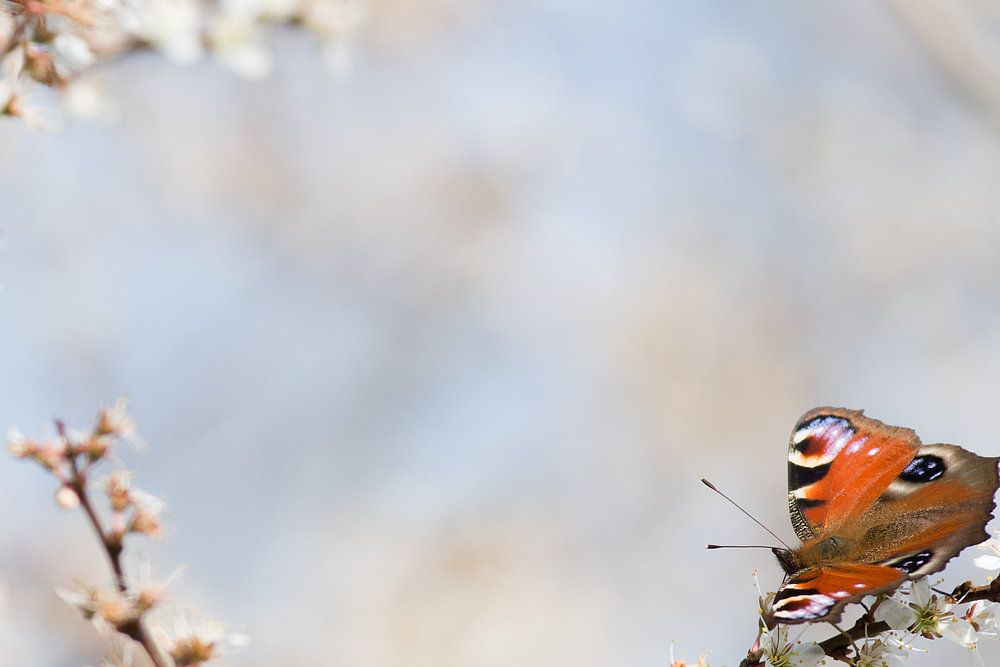 Dieser Atalanta-Schmetterling besuchte im Vorfrühling bei strahlendem Wetter einen blühenden Schlehdornstrauch. Die Farben des Schmetterlings bildeten einen schönen Kontrast zu den weißen Blüten des Strauches.