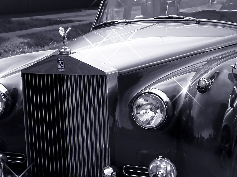 Ein schöner alter Oldtimer. Ein Rolls Royce mit glänzendem Chrom. Diese Schönheit sah unvergleichlich aus. Dieses Bild wurde in Schwarz-Weiß umgewandelt. Ein cooler und schöner Oldtimer!