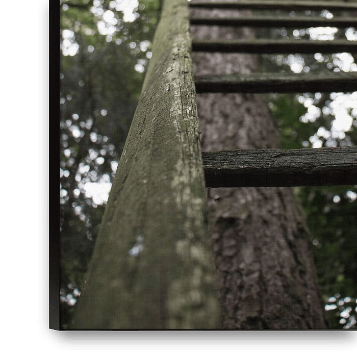 Eine alte Holzleiter lehnt an einem Baum. Würden Sie es wagen, da hochzuklettern?