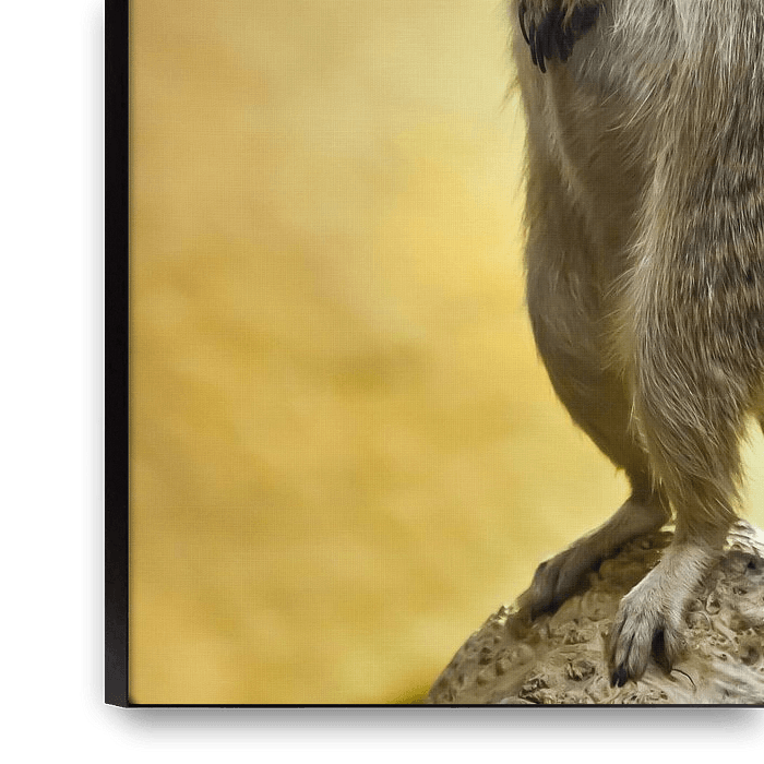 Bestelle das Foto Aufmerksame süße Erdmännchen-Wert-Kolumne. Wachsames Erdmännchen auf gelb-orangem Hintergrund. von Michael Semenov als Reproduktion auf Leinwand, Alu-Dibond, als Poster, Fototapete oder Acrylglasbild.