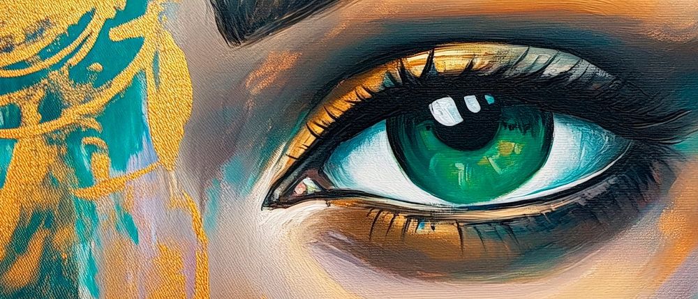 Ein hypnotisierender Blick, umrahmt von lebhaften Farben, zieht alle in seinen Bann. Die leuchtend grüne Iris, kombiniert mit goldenen Akzenten, strahlt Geheimnis und Tiefe aus. Perfekt für ein Wohnzimmer, verleiht dieses Kunstwerk dem Raum eine fesselnde Atmosphäre und lädt zu inspirierenden Gesprächen ein.
