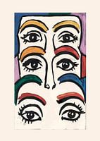Ein abstraktes Gemälde mit mehreren Augen und Augenbrauen in verschiedenen leuchtenden Farben.