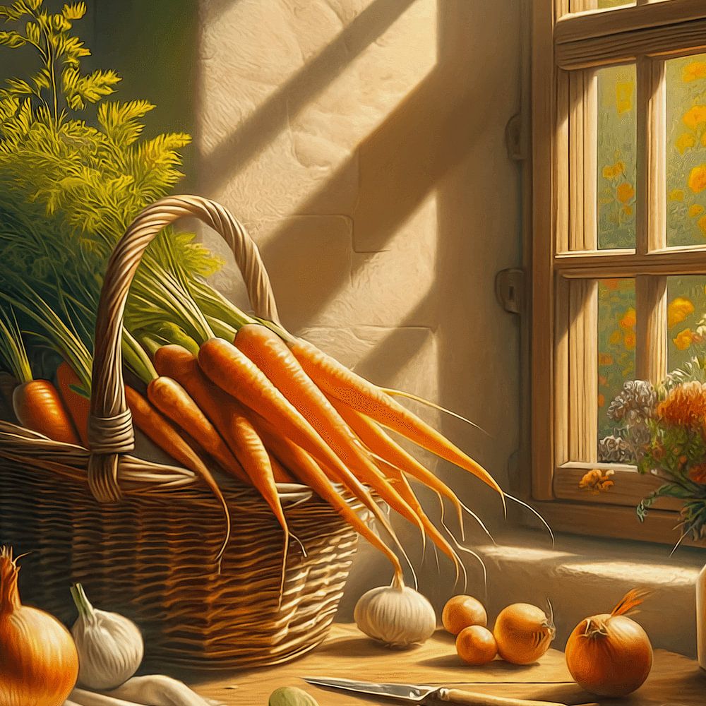 Aus dem Gemüsegarten, Karotten, Zwiebeln - fröhliches Stillleben mit Sonnenlicht