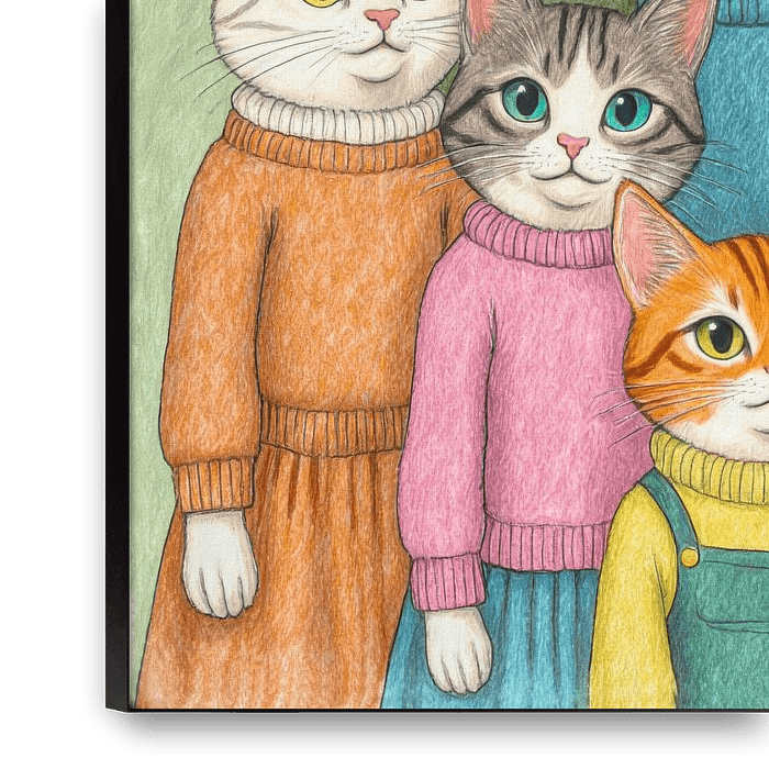 Eine Gruppe von zehn Katzen steht zusammen, jede mit einem einzigartig gefärbten Pullover bekleidet. Ihre Gesichtsausdrücke und ihre Anordnung ergeben ein charmantes Porträt vor einem sanften grünen Hintergrund.