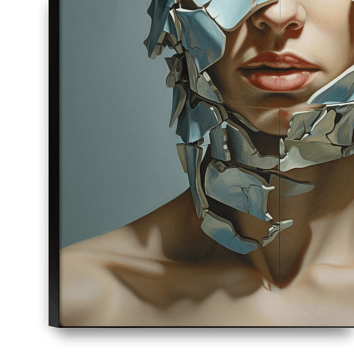 Frauengesicht welches mit zerbrochenen Scherben bestückt ist. Die Scherben lösen sich vom gesicht und der wahre Mensch, das wahre Selbst kommt zum Vorschein. Surreale Darstellung.