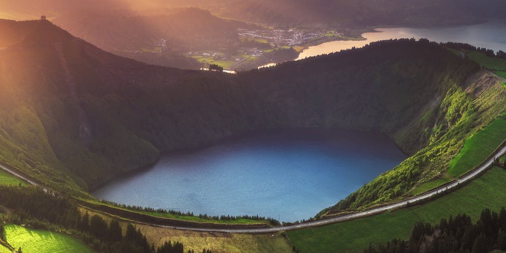 Die wundervollen kraterseen der Sete Cidades auf Sao Miguel zum Sonnenuntergang als Panoramabild. Sao Miguel, Azoren, Portugal.