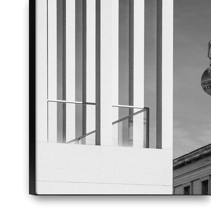 Bestelle dieses abstrakte Wandbild BERLIN Fernsehturm & Museumsinsel | Monochrom von Melanie Viola als Reproduktion auf Leinwand, Alu-Dibond, als Poster, Fototapete oder Acrylglasbild.