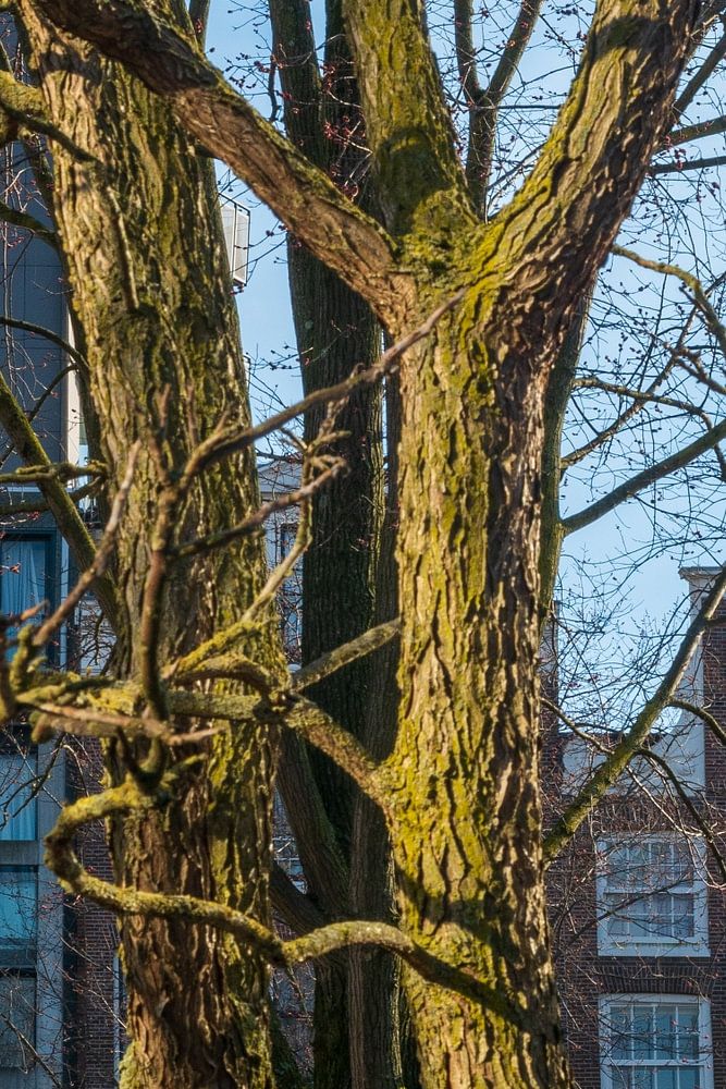Es ist ein Foto der Bäume in der Mitte des Denkmals, das an die Verfolgung der Juden in den Niederlanden erinnert. Während des Zweiten Weltkriegs. Die Bäume stehen in der Sonne, die von den großen Spiegeln des Denkmals reflektiert wird. Das Denkmal befindet sich in der Nähe des Waterlooplein in Amsterdam. Das Bild wurde mit meiner digitalen Fuji XA-1 Kamera mit einem Adapter für alte Objektive aufgenommen. Das verwendete Objektiv ist das Nikor 50 mm von meiner analogen Nikormat Kamera.