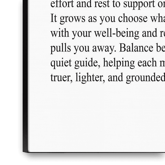 Dieses minimalistische Typografie-Poster rückt den Begriff Balance in den Fokus und steht für innere Harmonie und bewusste Ausrichtung. Die reduzierte Gestaltung fügt sich harmonisch in moderne Wohn- und Arbeitsräume ein.