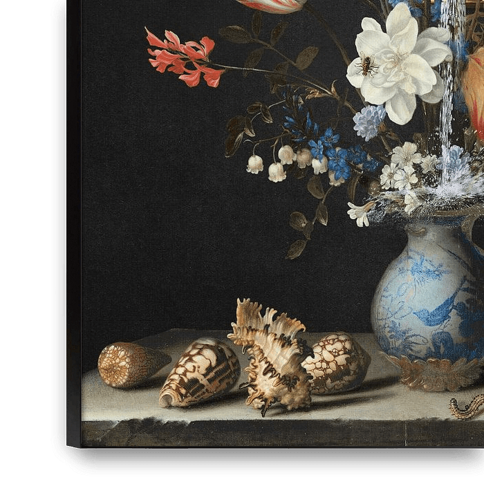 Die Blumenvase und die Muscheln stammen aus dem Stillleben „Blumen in einer Wan-Li-Vase und Muscheln“, gemalt um 1640-1650 vom niederländischen Künstler Balthasar van der Ast.