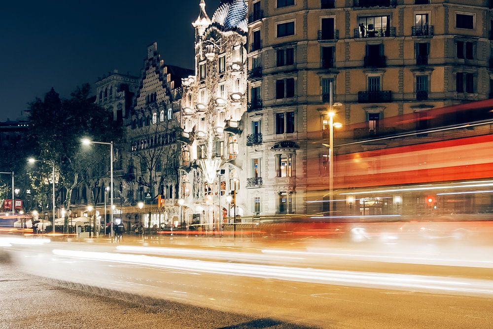 Barcelona bei Nacht: Ein Blick über den Boulevard Passeig de Gràcia auf Antoni Gaudís Casa Batlló.