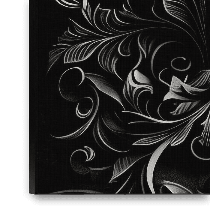 Eine raffinierte Schwarz-Weiß-Gravur mit einem komplizierten, von der klassischen Barockkunst inspirierten Blumenmuster. Die symmetrische Komposition hebt die wirbelnden Blätter und ornamentalen Details mit kühnen, fließenden Linien hervor, die Tiefe und Raffinesse verleihen. Vor einem dunklen Hintergrund hebt die elegante Verwendung…