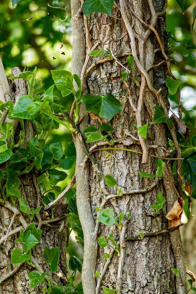 dünner Baumstamm, umwachsen mit erstickendem Efeu