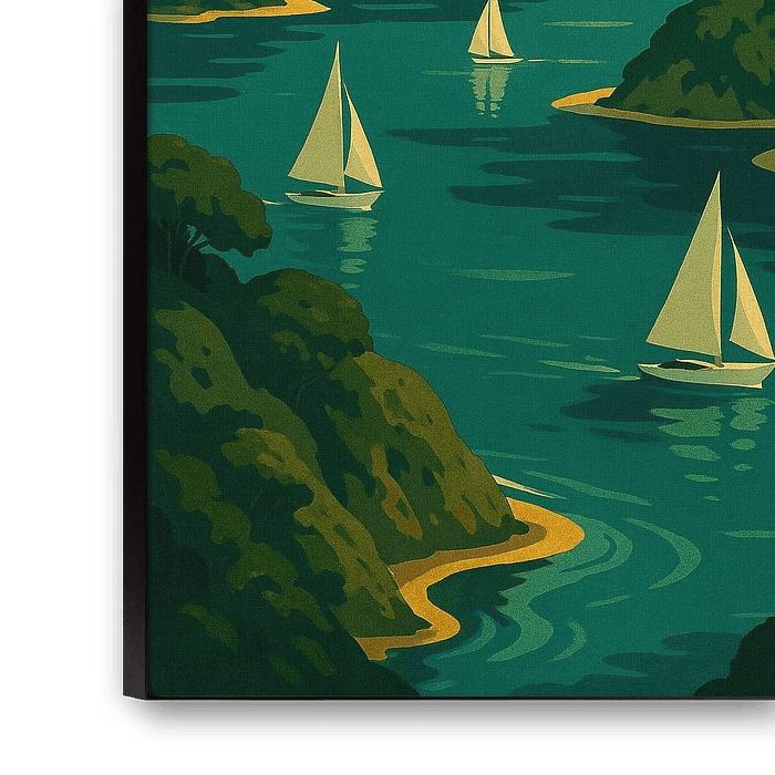 Dieses Kunstwerk ist ideal für Liebhaber des Segelsports, von Inselaufenthalten, tropischen Landschaften oder dem Leben an der Küste und verleiht jedem Raum eine luftige, sonnige Ästhetik. Es passt wunderbar in Strandhäuser, lichtdurchflutete Wohnzimmer, Schlafzimmer, Büros, Wellnessbereiche, Cafés oder Studios, die einen Hauch von ruhigem, maritimem Charme versprühen. Die Farbpalette aus Grün-, Blau- und Goldtönen unterstreicht helle, luftige Innenräume und passt gut zu Naturholz oder neutralem Dekor.