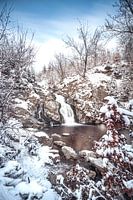 Eine Langzeitbelichtungsaufnahme des Wasserfalls von Bayehon in der nähe von die wallonischen Stadt Malmédy am Rande des Hohen Venns. Das Foto wurde im Winter aufgenommen, als die Landschaft mit einer Schneeschicht bedeckt war.