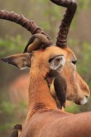 Eine Impala-Antilope bekommt eine Schönheitsbehandlung von Madenhacker-Vögeln. Die Vögel befreien die Impala von Parasiten.