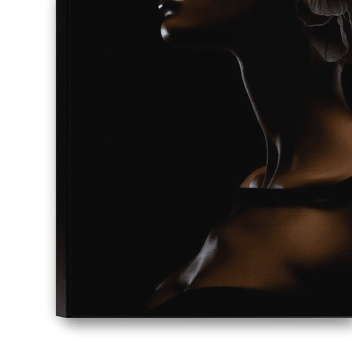 Ein kunstvolles Werk zeigt eine wunderschöne schwarze Frau im Profil vor einem schwarzen Hintergrund, gekrönt von einer luxuriösen Peonienblüte als Hut. Die Szenerie wirkt mystisch und zauberhaft, in dunklen Farben gehalten, und strahlt eine einzigartige Schönheit aus.